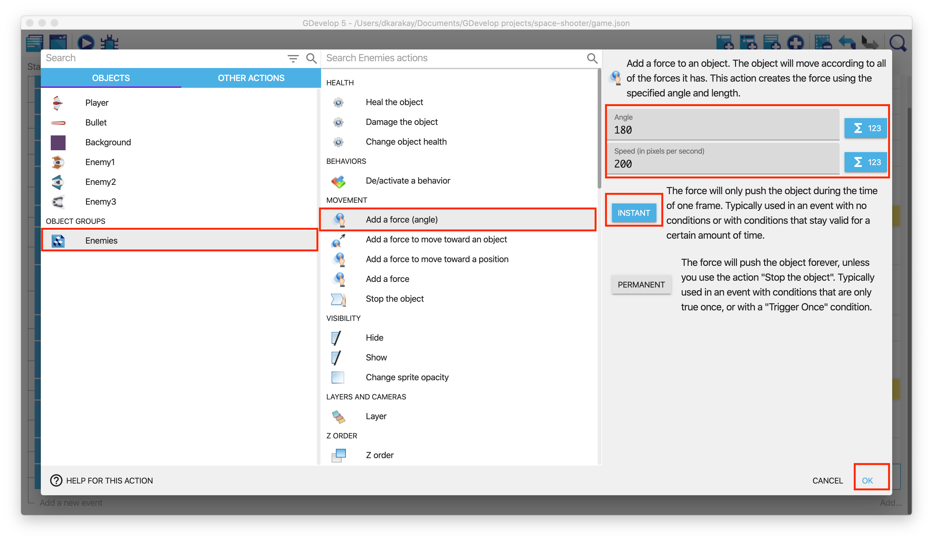 In the event's action, we will give a force to the Enemies as we did in the previous steps. Ensure that the angle is 180, the speed is 200 pixels per second, and the Instant option is checked.